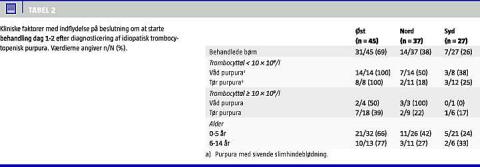 De kliniske faktorer, der var associeret med hurtig behandlingsstart på dag 1-2, var forskellige i de tre regioner (Tabel 2 ). Således behandlede man i Øst alle børn med trombocyttal < 10 × 109 /l på dag 1-2 uafhængigt af blødningsmanifestationer. I Syd blev seks af 20 med lavt trombocyttal behandlet på dag 1-2; fem af de seks behandlede havde trombocyttal < 5 × 109 /l. I Nord behandlede man primært børn med våd purpura. Behandling blev givet uafhængigt af barnets alder.