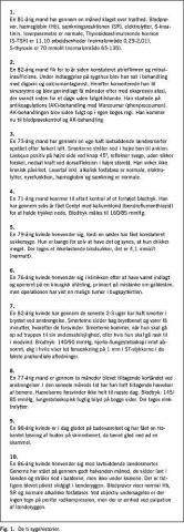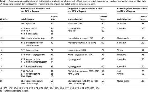 i et hollandsk studie (refereret på The Tenth WONCA Conference on Family Medicine i Singapore, den 20.-24. maj 1983) vurderet, at dette niveau er tilfredsstillende, men fastlæggelsen af niveauet synes at være arbitrær, og behovet for reproducerbarhed må afhænge af formålet med kodningen. Enkelte sygehistorier viste, at lægerne kunne være i tvivl om kodningsforeskriften for en diagnose (information på højest mulige niveau og om muligt den tilgrundliggende lidelse). Dette gælder for eksempel for sygehistorie syv (Fig. 1), som omhandlede en patient med brystsmerter, hvor nogle læger valgte diagnosen angina pectoris og andre iskæmisk hjertesygdom. I sygehistorie to, hvor en patient mødte til antikoagulationsbehandling, valgte lægerne som den tilgrundliggende lidelse at kode enten arytmia perpetua eller hjerteklaplidelse. Gruppering af diagnoserne i mere overordnede sygdomskategorier (f.eks. »hjertesygdom«) reducerede problemet væsentligt.