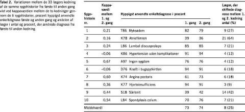 For den samlede gruppe af læger var der kun små afvigelser i hyppigst anvendte enkeltdiagnose mellem første og anden kodning. I gennemsnit (Tabel 2 ) ændrede ca. 25% af læger dog diagnose fra første til anden gang (spændvidde 9-64%). Ved Kappaanalyse af intraobservatørvariationen for enkeltdiagnose fandtes der for de ti sygehistorier en værdi på mellem - 0,06 og 0,60. Værdien var lavest for de sygehistorier, hvor næsten alle læger anvendte samme diagnose (Tabel 2).