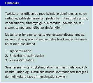 I befolkningsundersøgelser har man påvist, at flere kvinder end mænd lider af kroniske smerter. Markant flere kvinder end mænd rapporterer om smerteepisoder, specielt for hovedpine, mavesmerter og bevægeapparatsmerter [1]. Epidemiologiske data viser desuden, at kvinder rapporter om mere smerte, længerevarende smerteperioder og en højere frekvens af smerteepisoder end mænd [2]. Kvindelig dominans er desuden fundet i mange udbredte smertetilstande f.eks. colon irritabile, galdestenssmerter, øsofagitis, interstitiel cystitis, lændesmerter, fibromyalgi, piskesmæld, hovedpine, migræne og temporomandibulær dysfunktion [3]. Hormonbehandling i form af antikonception eller i forbindelse med klimakterium er i nogle tilfælde ledsaget af forøget risiko for kroniske smertetilstande [4] f.eks. temporomandibulær dysfunktion, lændesmerter og migræne. Desuden er colon irritabile, fibromyalgi, migræne, reumatoid artritis og temporomandibulære smerter typisk ledsaget af forøgede smertesymptomer i relation til menstruation. Derudover findes de kvindespecifikke smerter (eksempelvis endometriose og dysmenoré). Det tyder således på, at kvindelige kønshormoner har en betydning for udvikling og opfattelse af smerte. Det er dog ikke hele forklaringen på kønsforskellen, idet man så ville forvente, at kvinders og mænds smertemønster ville blive mere ens efter klimakteriet, men det er kun tilfældet for nogle af de kroniske smertetyper, f.eks. hovedpine. Genetiske variationer kan også spille en rolle, hvor eksempelvis variation i catechol-O-me-thyltransferase (COMT)-genet har været associeret til smertesensitiviteten og nogle smertetilstande med kvindelig prædominans (f.eks. fibromyalgi).