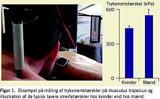Smertesensitiviteten hos mænd og kvinder kan undersøges ved standardiserede smertestimuleringer. Traditionelt er hudsmertesensitiviteten undersøgt ved mekanisk stimulation, varmestimulation eller elektrisk stimulation, hvorved smerte- eller tolerancetærskler bestemmes. I en metaanalyse har man påvist, at kvinder har lavere smerte- og tolerancetærskel end mænd [5]. En vis spredning inden for mande- og kvindegruppen er forventelig, hvilket betyder, at der kan findes mænd og kvinder med samme smertetærskler. Desuden kan undersøgelsesformen påvirke resultatet, eksempelvis forskelligt køn hos personen, der undersøges, og forsøgslederen (se senere afsnit). Smertetærsklen for trykstimulationer er en specielt robust parameter til at påvise smertesensitivitetsforskellen mellem mænd og kvinder med (Figur 1 ). I en anden meta-analyse påviste man desuden, at det er karakteristisk med forøgede smertetærskler i den follikulære fase af menstruationscyklen sammenlignet med i senere faser [6], som igen viser en betydelig hormonel interaktion.