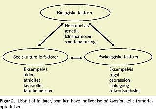 Kvinder og mænd oplever smerter forskelligt, og meget tyder på, at nogle lægemidler virker forskelligt afhængig af køn. Kønsforskelle i smertereaktioner involverer multiple biologiske, psykologiske og sociokulturelle faktorer såsom tidligere smerteoplevelser, kulturelle aspekter, hormonel status og specifikke forskelle i det nociceptive nervesystems mekanismer (Figur 2 ). I smertebehandlingen tages der ikke hensyn til mulige kønsforskelle, og mere forskning er nødvendig for at klarlægge disse forhold.