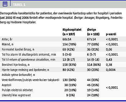De patienter, der blev indlagt på Rigshospitalet, var yngre (p < 0,0001), omfattede flere mænd (p < 0,0001), og endvidere var flere patienter blevet forsøgt genoplivet før ambulancepersonalets ankomst sammenlignet med de patienter, der blev indlagt på andre hospitaler, se Tabel 1 . Ventrikelflimmer (VF) eller pulsløs ventrikulær takykardi (pVT) som initial rytme var hyppigere hos patienter, der blev indlagt på Rigshospitalet. Formodet kardiel årsag til hjertestop var 42% for patienterne, der blev indlagt på Rigshospitalet, mod 31% hos patienter, der blev indlagt på andre hospitaler, p = 0,06.