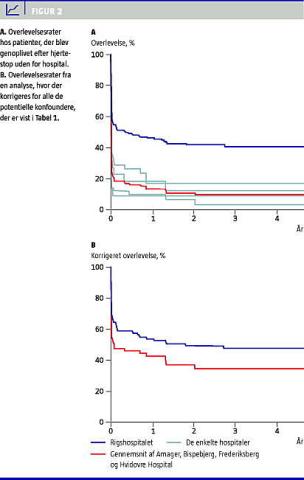 De to typer hospitaler, der indgår i denne undersøgelse, er sammenlignelige på en række områder: Alle er universitetshospitaler, har egne intensiv- og kardiologiske afdelinger, og er alle akkrediterede af Joint Commision , hvilket sikrer en ensartet minimumsstandard for behandling af hjertestop. Samtidig er der dog en række forskelle på den højt specialiserede afdeling og de øvrige afdelinger, som kan have indflydelse på overlevelsen. Akut koronararteriografi og -intervention samt mekanisk cirkulationsstøtte [16] er udelukkende tilgængelige på Rigshospitalet, men patienter med behov for disse undersøgelser har kunnet overflyttes umiddelbart. Dialyse og hæmofiltration ikke er tilgængelige på alle de øvrige hospitaler. Der er også forskelle i intensivafdelingernes størrelse og organisering, og tilgængeligheden af speciallæger i vagten kan være forskellige. Betydningen af disse faktorer i forhold til overlevelse kan ikke vurderes i denne analyse, men dette kan tænkes at påvirke akutlægebilens afgørelse om, hvor patienten skal indlægges. Lignende forskelle er tidligere vist i to nordiske materialer, men relationen til forskelle i overlevelse blev ikke nærmere undersøgt [4, 6]. Hvorvidt koronar arteriografi og eventuel koronar eller anden kardiologisk intervention har indflydelse på overlevelsen efter hjertestop kan ikke sikkert belyses i nærværende analyse, men en eventuel højre overlevelse på grund af disse procedurer vurderes ar være beskeden i forhold til overlevelse hos disse svært syge patienter, og patienter, der blev overflyttet til behandling fra et af de øvrige hospitaler, vil forsat være allokeret til det primært modtagne hospital i denne analyse. Som et surrogat herfor er formodet kardiel genese til hjertestop medtaget i den multivariate analyse, hvorfor de fundne forskelle i overlevelsen er søgt justeret herfor.