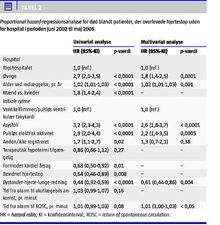 Multivariat analyse viste, at indlæggelse på et andet hospital end Rigshospitalet, anden rytme end VF/pVT, samt længere tid til ROSC og manglende hjertelungeredning ved bystander før ambulancens ankomst var uafhængige prædiktorer for død efter hjertestop uden for hospital, se Tabel 2. Hos gruppen med formodet kardiologisk årsag til hjertestop var den justerede hazard ratio 1,5 (p = 0,14).