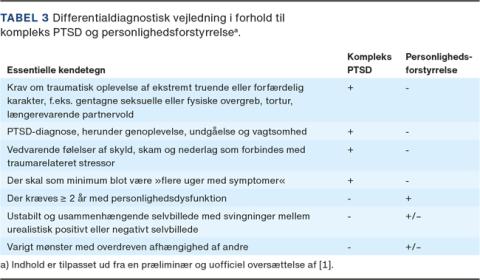 Ud fra en komparativ gennemgang af definitionerne på kompleks PTSD og personlighedsforstyrrelse i ICD-11 har denne artikel til formål at skitsere ligheder og forskelle mellem de to diagnosers nosologi. Vi ønsker herudfra at give klinikere et vejledende overblik, som forhåbentlig kan lette overgangen til ICD-11. Det er naturligvis behørigt, at dette overblik også understøttes og efterprøves empirisk, når ICD-11-diagnoserne med tiden tages i brug.