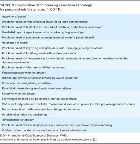 Som det fremgår af Tabel 2 er ICD-11-diagnosen for personlighedsforstyrrelse baseret på en generel vurdering af dysfunktion i aspekter af selvet og relationen til andre samt emotionelle, kognitive og adfærdsmæssige manifestationer heraf. Den globale sværhedsgrad af forstyrrelsen klassificeres som enten »let«, »moderat« eller »svær«. Herudover har klinikeren mulighed for at anvende tillægskoder, såkaldte »specifiers«, som ikke er diagnoser, men udfolder nuancerne af den diagnosticerede personlighedsforstyrrelse: negativ affektivitet, tilbagetrækning, dyssocialitet, mangelfuld hæmning og anankasme. Efter at sværhedsgrad er diagnosticeret og personlighedstræk er beskrevet, har klinikeren yderligere mulighed for at specificere, om det samlede billede ligner det velkendte borderlinemønster [1, 14, 18].