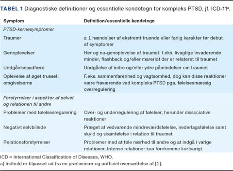 Med ICD-11 får vi mulighed for at stille diagnosen kompleks PTSD, hvilket inkluderer både klassiske PTSD-symptomer samt vedvarende forstyrrelser i personlighedsfunktionen [1-7]. Denne diagnose erstatter ICD-10-diagnosen F62.0 Personlighedsændring af katastrofeoplevelse. Grundet store konceptuelle og empiriske overlap har man ofte sammenlignet kompleks PTSD med personlighedsforstyrrelse, herunder typisk borderline og ængstelig-evasiv type [5, 8, 9]. Der har sågar været argumenteret for, at ICD-11-diagnosen kompleks PTSD overflødiggør diagnosen borderline personlighedsforstyrrelse [10], mens andre har søgt at fremhæve forskellene mellem disse diagnoser [11, 12]. Tilsvarende er der fremhævet ligheder imellem kompleks PTSD og undvigende personlighedsforstyrrelse, med vægt på undgåelsesadfærd [13].