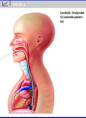 Med CardioQ (Figur 2 ) måles CO via øsofageal Doppler. Systemet består af en monitor og en øsofagussonde med en ultralydstransducer i spidsen. Ved korrekt placering ligger proben tæt på og parallelt med aorta descendens. Fra spidsen af proben transmitteres et ultralydsignal ind mod aorta descendens. Signalet reflekteres af blodet og opfanges af transduceren. Ultralydsbølgens ændring i frekvens er direkte proportional med hastigheden af det cirkulerende blod, og herved kan blodets distance pr. slag beregnes. Da man antager, at aorta descendens' tværsnitsareal er konstant hos den enkelte patient, kan slagdistancen beregnes, og hermed kan slagvolumen i aorta descendens estimeres. For at estimere slagvolumen ud fra flowhastighed, anvender man i CardioQ-systemet et nomogram baseret på patientens alder, højde og vægt [10].