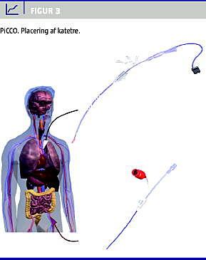 Med PiCCO (Figur 3 ) måles CO via pulskonturanalyse (digitalanalyse af den arterielle pulskurve), hvorved venstre ventrikels slagvolumen estimeres slag for slag. Systemet består af en monitor, en termoføler, der tilkobles et almindeligt centralt venekateter, og et specielt arteriekateter med en termoføler på spidsen. Arteriekatetret indføres i a. femoralis eller a. axillaris, så spidsen er tæt på aorta. Systemet kalibreres ved intermitterende transpulmonal termodilution. Ud over CO-måling kan man med PiCCO-systemet estimere globalt slutdiastolisk volumen som surrogatmål for hjertes fyldning og ekstravaskulært lungevand som surrogatmål for lungeødem [11].