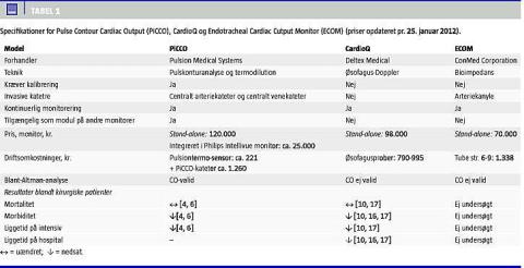 I tre oversigtsartikler beskrives det, at CO-monitorering med øsofagus-Doppler gav signifikant kortere indlæggelsestid og færre postoperative komplikationer end traditionel monitorering [10, 16, 17]. I to af disse oversigtsartikler fandt man også, at patienterne havde signifikant færre dage på intensivafdelingen og mindre morbiditet [10, 17]. Der var dog ikke forskel i mortalitet, hverken når øsofageal Doppler blev sammenlignet med konventionel monitorering eller med PAC [10, 16, 17].