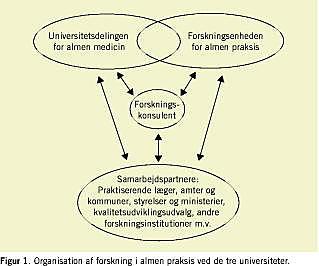 Gennem de seneste årtier er antallet af danske videnskabelige publikationer i internationale peer review 'ede tidsskrifter om almenmedicinske emner steget betydeligt [2]. Hovedparten af almenmedicinsk forskning i Danmark udføres på universitetsafdelinger og de tre forskningsenheder for almen praksis (Figur 1 ). Opgaverne omfatter gennemførelse af forskningsprojekter, metodeudvikling, undervisning, vejledning, uddannelse af ph.d.-kandidater og internationalt samarbejde. Forskningsenhederne er selvejende institutioner, hvor driften primært finansieres via basisbevilling fra en fond, der er skabt ved overenskomsten mellem Sygesikringens Forhandlingsudvalg og Praktiserende Lægers Organisation [3]. Forskningsinstitutionerne udfører sundhedstjenesteforskning med fokus på almen praksis. Heri omfattes analyse af almen praksis som organisation, dens opgaver i sundhedsvæsenet, resultater og aktiviteter samt følgerne af sundhedsvæsenets udformning og aktiviteter for befolkningens helbred, funktionsevne og livskvalitet. Andre emner er befolkningens og lægernes håndtering af hyppigt forekommende symptomer og sygdomme, forebyggelse, analyse og udvikling af konsultation og kommunikation. Forskningsdisciplinerne spænder fra epidemiologi og klinisk forskning til kvalitativ forskning, ofte i et inspirerende samarbejde med forskere fra andre institutioner. Fremtidige indsatsområder er analyse af samspillet mellem almen praksis og det øvrige sundhedsvæsen, håndtering af utilsigtede hændelser og spørgsmålet om, hvordan patientevalueringer kan inddrages i udviklingen af almen praksis.