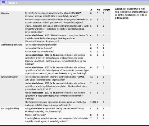 Resultater: Vi fik besvarelser fra 11 hospitaler. Seks hospitaler angav at have afsat et fast beløb til forskning. Beløbsstørrelsen blev kun angivet i fire tilfælde svarende til henholdsvis 0,1%, 0,3%, 0,3% og 0,6% af hospitalernes overordnede driftsbudgetter. De oplyste beløb varierede fra 1,1 til 7,1 millioner kroner. Hovedparten af hospitalerne havde både forskningslektorer og kliniske lektorer, men kun fem havde professorer. Syv hospitaler stillede lokaler til rådighed for forskning. Otte hospitaler afholdt staff meetings, og fire udgav en forskningsårsberetning.