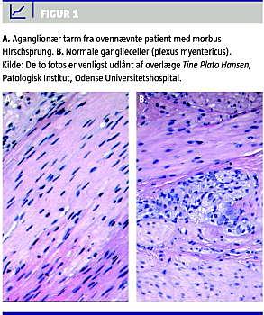 En fuldbåren pige, der var født af raske forældre, viste i de første levedøgn tegn på meconiumileus. Peroperative biopsier fra colon og tyndtarm viste total aganglionær tarm (Figur 1 ), hvilket er foreneligt med morbus Hirschsprung. Der blev anlagt en høj jejunostomi 50 cm distalt for Treitz ligament. Yderligere resektion var nødvendig på grund af pseudoobstruktion, således at patienten endte med 35 cm tyndtarm. Hun blev ernæret med PN i et tunneleret centralt venøst kateter (CVK) og varierende mængder af mad. I forløbet havde pigen flere kateterinfektioner, som nødvendiggjorde skift af CVK. Okkluderede vener gjorde det imidlertid tiltagende svært at finde intravenøs adgang. Alt dette til trods havde pigen en normal fysisk og psykomotorisk udvikling. Familien stod selv for det meste af plejen og blev oplært til at administrere hjemme-PN.