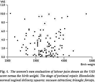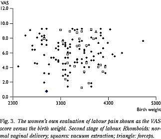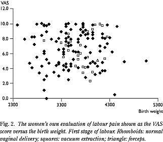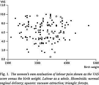 Det primære formål med vores undersøgelse var at belyse en eventuel sammenhæng mellem kvindernes angivelse af smerteintensiteten og barnets vægt, hvilket trods spørgsmålets kliniske relevans sjældent er undersøgt. Ranta et al fandt ikke nogen sammenhæng mellem disse faktorer (7), mens Melzack et al viste en stigende smerteintensitet ved stigende fostervægt, dog kun for fleregangsfødende (6). I vores undersøgelse, som kun vedrører førstegangsfødende, fandtes ingen sammenhæng mellem smerteangivelsen og fostervægten i intervallet fra 2.400 til 5.050 gram.
