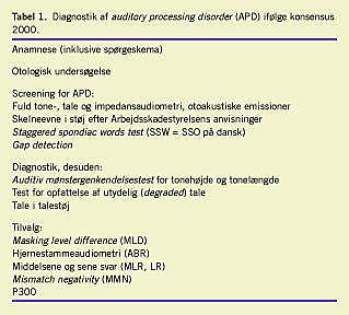 Summary Disturbance in processing auditory impulses from the ears: Auditory processing Disorder: Ugeskr Læger 2007;169(18):1663-1665 Over the last decade evidence on the existence of auditory processing disorder (APD) has increased. Therefore, it is now time to deal with the phenomenon in daily clinical work. This article gives information about APD, especially about problems with the definition of APD, diagnosing APD and the treatment.