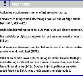 Abdominale aortaaneurismer kan behandles ved åben abdominal resektion eller endovaskulært (EVAR), som er et mindre traumatisk indgreb med lavere tidlig mortalitet og morbiditet. Tolv studier indgår. Resultaterne indikerer, at ved aneurismer > 5,5 cm i diameter kan EVAR anbefales til patienter med komorbiditet. Yngre patienter med mindre komorbiditet vil formodentlig være bedst tjent med åben resektion, set i lyset af fortsat rupturrisiko og behov for livslang kontrol efter EVAR. Højrisikopatienter skal uanset valg af behandlingsmetode præoperativt optimeres medicinsk.