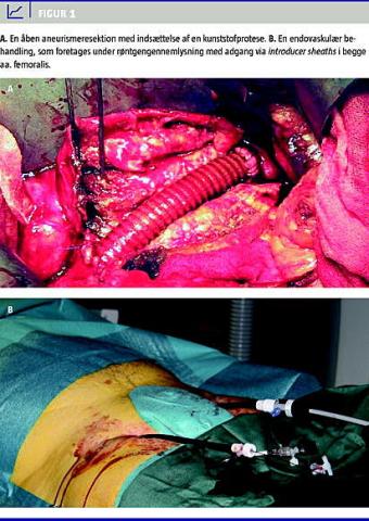 Tidligere var behandlingen primært aneurismeresektion med indsættelse af en kunststofprotese foretaget ved åben abdominal resektion (OR), men endovaskulær behandling (EVAR) er nu en rutineprocedure. EVAR består i endoluminal anlæggelse af en selvekspanderbar stentgraft (en protesebeklædt metalstent) i aorta med adgang via aa. femoralis communis og er et mindre kirurgisk traume end OR (Figur 1 ).