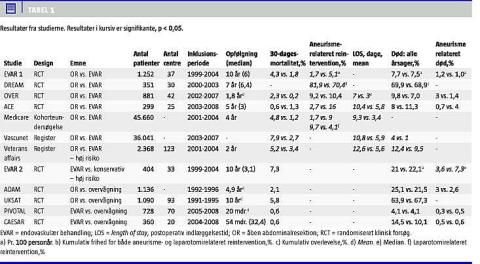 Der findes to større randomiserede studier (engelske EVAR1 og OVER fra USA) [12, 17, 18] og to mindre (hollandske DREAM og franske ACE) [19-23], hvor man har sammenlignet resultaterne efter EVAR og OR.