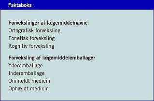 Ifølge internationale opgørelser skyldes 8-25% af rapporterede medicineringsfejl forvekslinger mellem lægemidler [1, 2]. Fire procent af de overvågede dispenseringer i Danmark er fejlbehæftede, og heraf kan op til 60% skyldes forvekslinger [3]. Forvekslinger af lægemidler deles op i forvekslinger af lægemiddelnavne og forvekslinger af lægemiddelemballager [2]. Navneforvekslingerne opstår pga. lighed mellem generiske navne eller handelsnavne. Ligheden kan være ortografisk og/eller fonetisk [2]. Ortografisk lighed betyder lighed ved håndskrift, maskinskrift og/eller computertekst. Fonetiske navneforvekslinger sker, fordi to navne lyder ens. Dette er en risiko ved mundtlige ordinationer og ved diktat til båndoptager. Emballageforvekslingerne opstår pga. visuel lighed mellem inderemballager (som ampuller, blisterpakninger og hætteglas), yderemballager (som den æske, inderemballagen ligger i), omhældt medicin (løse plastposer) og ophældt medicin (optrukne sprøjter, væskeblandinger, løse tabletter, dosispakker).