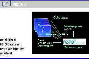 Databasen fik i 2007 støtte fra Danske Regioner til udvikling og opstart, og der blev nedsat en landsdækkende tværfaglig styregruppe forankret i Dansk Føtalmedicinsk Selskab (DFMS). For at sikre sammenligneligheden af data er der for hele landet opnået enighed om fælles referencer, og der er udarbejdet fælles retningslinjer for indtastning af lokale data i samme føtalmedicinske elektroniske journalsystem (Astraia). Til monitorering af kvaliteten er der defineret ni standardindikatorer. I Figur 1 vises de datakilder, som FØTO-databasen er opbygget omkring. Fra de lokale Astraiaservere, som indeholder ultralyd- og screeningsdata, sendes der dagligt data til en fælles server. I analyseportalen samkøres Astraiadata med data fra Dansk Cytogenetisk Centralregister, Landspatientregisteret og Fødselsregisteret vedrørende graviditetens udfald. Databasen er landsdækkende og indeholder data fra 1. januar 2008. Dataene har siden 2011 været tilgængelige gennem analyseportalen, og pr. 31. maj 2012 indeholdt databasen data om 236.593 graviditeter. I november 2011 offentliggjorde man den første årsrapport fra databasen [3]. Der er fri adgang til data fra egen afdeling, og det er muligt at ansøge om adgang til landsdækkende data til forskningsprojekter. Ansøgninger skal godkendes af databasens styregruppe, forskningsudvalget under DFMS og Datatilsynet. Der er ansøgt fra 22 forskningsprojekter, af hvilke der hidtil er leveret data til 11.
