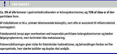 Denne artikel omhandler fotodynamisk behandling af inoperable hilære kolangiokarcinomer (CC) og en gennemgang af de foreliggende data vedrørende denne behandling. CC er en malign kræftform, som udgår fra epitelet i galdevejene. Samlet udgør denne kræftform ca. 3% af alle tumorer i gastrointestinalkanalen [1]. I Danmark er incidensen under en pr. 100.000 [2].