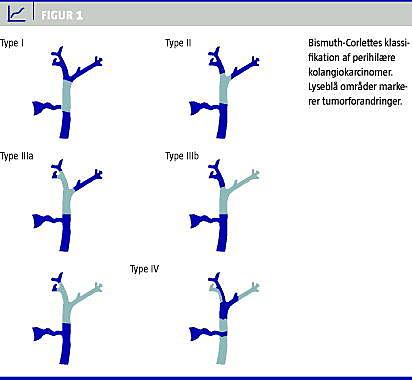 CC klassificeres efter lokalisation som intra- og ekstrahepatiske. Sidstnævnte underinddeles i peri-hilære eller distale tumorer. Intrahepatiske CC udgør 5-10%, mens den perihilære form udgør 60-70% af alle tilfælde. Perihilære CC benævnes også Klat-skintumorer og kan anatomisk klassificeres efter Bismuth-Corlettes klassifikation, hvor type I er tumorer, som er beliggende i ductus hepaticus communis, type II involverer bifurkaturen, type IIIa og IIIb involverer henholdsvis ductus hepaticus dexter og sinister, mens type IV involverer begge sider eller er multi-fokal (Figur 1 ) [1, 3]. Ca. 90% af CC er adenokarcinomer med høj differentieringsgrad [4]. Den intrahepatiske form er oftest den mest aggressive, der har hurtig vækst og fjernmetastaserer til bl.a. lymfeknuder, peritoneum og lunger. Den perihilære form er mere indolent og lokoregional med intraluminal og longitudinel vækst i submucosa samt spredning til kar og lokale lymfeknuder [4, 5].