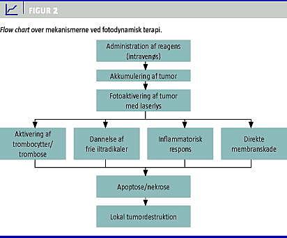 Hovedkomponenterne ved behandlingen er et kemisk reagens, som exciteres, når det udsættes for lys af en specifik bølgelængde. Der findes flere grupper af reagenser, som kan medføre fotosensibilitet. De mest anvendte reagenser er baseret på modifikationer af porfyrin. Stoffernes makromolekylære sammensætning medfører ophobet koncentration i og forsinket eliminering fra malignt væv, men der er også forsinket eliminering fra huden. Stofferne absorberer lys, som hermed medfører ændring fra grundtilstanden til et exciteret stadie, hvorved der dannes frie iltradikaler. Dette kaldes også fotoaktivering, og for flere af reagenserne opnås der excitation ved applicering af lys med en bølgelængde på 630 nm. Dannelsen af frie iltradikaler fører til apoptose, mikrovaskulær trombose og nekrose. Det fotoaktiverede stof kan også gøre direkte skade på cellemembranen, men denne mekanisme udgør kun en lille del af den samlede effekt [10, 11]. En tredje mekanisme menes at være tumorspecifik immunreaktion induceret af PDT (Figur 2 ) [12]. Dybden af vævsnekrosen er 4-6 mm.
