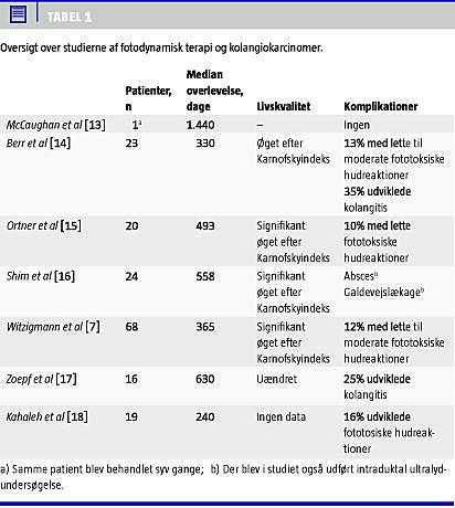 I et randomiseret studie indgik der 39 patienter. Patienterne i gruppe A (n = 20) fik foretaget endoskopisk drænage med stentanlæggelse og efterfølgende PDT, og patienterne i gruppe B (n = 19) fik alene foretaget endoskopisk drænage med stentanlæggelse. Gruppe A bestod af fire patienter med Bismuth-type III og 16 med type IV, mens fordelingen i gruppe B var to med type II, to med type III og 15 med type IV. Der blev givet oral antibiotikaprofylakse i 14 dage. PDT-gruppen blev fotosensibiliseret med porfyrinderivatet photofrin 2 mg/kg og 48 timer senere fotoaktivering ved 630 nm med en lysdosis på 180 J/cm 2 og en eksponeringstid på 750 s. Patien-terne opholdt sig herefter i mørklagt rum i 3-4 dage og blev gradvist reeksponeret for dagslys. I gruppe A blev der efter PDT observeret signifikant fald i S-bi-lirubin. Den mediane overlevelse var for gruppe A og B henholdsvis 493 og 98 dage (p < 0,0001). Som følge af disse tal valgte man af etiske årsager at stoppe studiet [15]. I et ikkerandomiseret studie, hvor der var inkluderet 24 patienter med CC, blev der foretaget perkutan stentning med efterfølgende PDT. Effekten af terapien blev vurderet med intraduktal ultra-lyd-skanning foretaget før og på månedlig basis efter PDT. Den mediane overlevelse var 558 dage. Gennemsnitstykkelsen af forandringerne i galdevejene var 8,7 ± 3,7 mm før PDT, og der blev observeret aftagende tykkelse til 5,8 ± 2,0 mm. Efter fjerde måned var der igen tiltagende tykkelse [16].