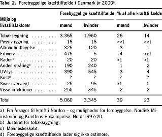 På basis af eksponeringsforholdene i hver af de nordiske befolkninger, den cancer- og dosisspecifikke relative risiko, samt forekomsten af de berørte cancerformer i befolkningerne, udregnede gruppen et bedste skøn over antallet af kræfttilfælde, som på daværende tidspunkt kunne tilskrives hver af de kræftfremkaldende påvirkninger, herunder de tumorspecifikke ætiologiske fraktioner. Tabel 2 viser forebyggelsespotentialet i Danmark, baseret på cancerforekomsten i 2000. Således var konklusionen dengang, at vi ved en indsats rettet mod de kendte kræftfremkaldende faktorer i vores omgivelser (som i sig selv er en vanskelig opgave) kunne opnå en reduktion i cancerforekomsten i Danmark på 39% hos mænd og 23% hos kvinder. De enkelte cancerformer viste et meget varierende forebyggelsespotentiale, således 80-95% for kræft i lunge, lungehinde, strube, mundhule, svælg og spiserør, samt malignt melanom, 40-80% for kræft i blære, mavesæk og livmoderhals, og mindre end 10% for kræft i tyktarm og leukæmi.