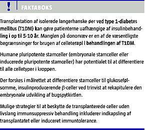 Selv om rekonstruktion af en funktionel β-cellemasse gennem transplantation af isolerede Langerhanske øer kan genskabe euglykæmi i fravær af insulinbehandling, er anvendelsen af celleterapi til behandling af type 1-diabetes vanskeliggjort af bl.a. manglen på donormateriale. Fremskridt i målrettet differentiering af stamceller imod β-celler ved trinvis at rekapitulere fosterudviklingen tyder på, at stamceller er en egnet kilde til frembringelse af β-celler. Vi kaster her lys over nogle af de problemstillinger, som i øjeblikket forhindrer brugen af cellebaserede diabetesterapier i klinikken.