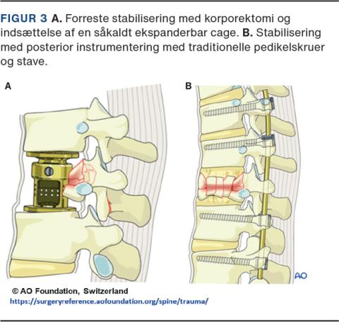 Sammenfattende anvendes kirurgisk behandling til frakturer, som på baggrund af ovenstående kriterier vurderes at være mekanisk instabile [15]. Kirurgisk behandling af frakturer i columna thoracolumbalis kan foretages via en posterior adgang, via retroperitoneal/transtorakal adgang til columnas forside eller ved en kombination (Figur 3). Cervikalt kan man ligeledes stabilisere frakturer via anterior eller posterior adgang. Ved neurologisk påvirkning foretages medullær dekompression mhp. aflastning af nervevævet (medulla og/eller nerverødder). Hos patienter med lammelser og billeddiagnostisk verificeret årsag til medullær affektion bør behandlingen foretages hurtigst muligt med stabilisering af frakturen og overflytning til en højtspecialiseret afdeling for rygkirurgi med mulighed for neurointensiv support. Mean arterial pressure > 80 mmHg bør tilstræbes initialt [14, 16]. Herudover er formålet med operationen at opnå hurtig mobilisering af patienten for at mindske risikoen for komplikationer ved langvarigt sengeleje i form af dyb venøs trombose, lungeemboli, pneumoni, urinvejsinfektion og tryksår [17].
