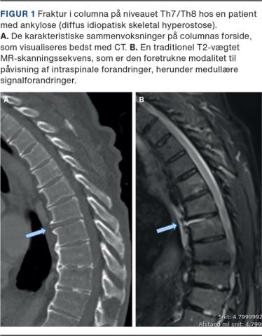 CT af columna muliggør sikker bestemmelse af frakturniveau og giver mulighed for tredimensionel evaluering af frakturer samt vurdering af intraspinale pladsforhold og evt. patologi. Yderligere udredning med MR-skanning muliggør afklaring af evt. læsioner i disci og ligamenter, hvilket har betydning for vurdering af stabiliteten. Hos patienter med ankylose bør rygsmerter efter et traume eller strukturelle forandringer set på CT altid udløse supplerende MR-skanning, da instabile gennemgående læsioner i disci og ligamenter særligt forekommer i denne patientgruppe [7-9]. Ud over den initiale CT er efterfølgende MR-skanning førstevalg ved mistanke om medullær påvirkning eller patologisk fraktur, ligesom anvendelse af short tau inversion recovery (STIR)-MR-skanning giver mulighed for at skelne en frisk fraktur fra et ældre sammenfald [10].