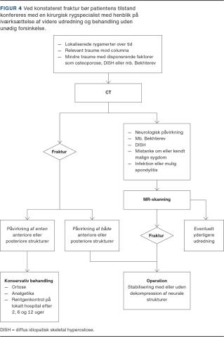 Beslutning om behandling tages ud fra en samlet vurdering på baggrund af følgende faktorer: 1) strukturelle forandringer set på CT og kategoriseret ud fra AO Foundation-klassifikation. (Figur 2 viser som eksempel klassifikationen for torakolumbale brud), 2) neurologisk status på baggrund af klinisk undersøgelse, 3) MR-skanning for at kunne differentiere mellem frakturer af typen B2 og A1 (Figur 2) og 4) disponerende faktorer som ankylose og osteoporose.
