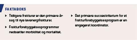 Der er stor forskel på opbygningen og derved effekten af de FFP’er, der er blevet indført rundt om i verden. En systematisk litteraturgennemgang har vist, at metoder, der var lig FLS, var de bedste til at opspore patienter og fastholde dem i forebyggende behandling, hvorved fremtidige frakturer kunne forebygges [20]. Her blev der lagt vægt på, at det ikke var nok blot at forbedre befolkningens viden om området eller uddanne bestemte professioner, herunder praktiserende læger, radiologer og ortopædkirurger. Den tilgang, der bedst nedsatte risikoen for efterfølgende frakturer, var et intenst program med en dedikeret koordinator, som selv screenede og uddannede patienterne [20]. I Dan-mark har Sundhedsstyrelsen i en medicinsk teknologivurdering [21] anbefalet, at fremtidige FFP’er skal omfatte en sygeplejerske, som skal have særligt ansvar for denne opgave samt visitere, informere og undervise patienterne og koordinere behandlingen.