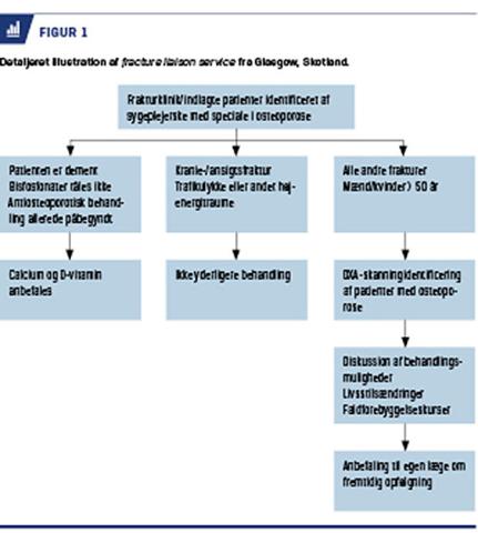 typisk en specialiseret sygeplejerske, som får det fulde ansvar for denne patientgruppe for at sikre, at alle patienter, som får en fraktur forårsaget af osteoporose, efterfølgende får optimal behandling. Koordinatoren sørger for at opspore alle patienter, som bliver indlagt på en ortopædkirurgisk afdeling eller bliver bragt til skadestuen med en fraktur. En deltaljeret illustration af FLS kan ses i Figur 1.