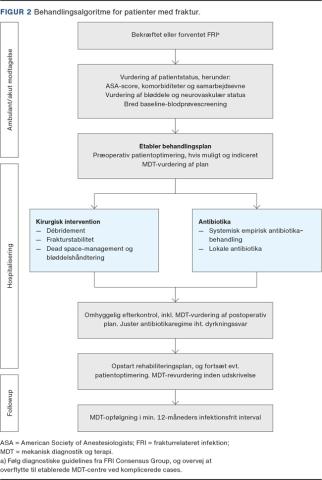 Formålet med FRI-behandlingen er at opnå frakturheling, infektionssanering, smertelindring og bevarelse af patientens funktionsevne. FRI ledsages af biofilm, hvor bakterierne sætter sig på overfladen af implantat og knogle, deler sig langsomt og nedsætter metabolismen. Biofilmbakterier kan derfor ikke behandles med antibiotika alene [18]. Ved formodet eller bekræftet FRI er primærbehandlingen derfor kirurgisk revision inklusive multiple dybe vævsprøver og efterfølgende behandling med systemiske antibiotika. Det gælder også i de tilfælde, hvor man har mistanke om FRI, og hvor man ønsker at undgå forsinket behandling med de deraf følgende konsekvenser. I praksis er forløbene ofte komplekse og afhænger af omfanget af osteomyelitis, bakterielt resistensmønster, frakturens stabilitet og bløddelenes tilstand samt patientens komorbiditeter og samarbejdsevne. En centralisering af osteomyelitisbehandling til et multidisciplinært team bestående af ortopædkirurger, plastikkirurger, radiologer, mikrobiologer og infektionsmedicinere på et højtspecialiseret center har vist sig at kunne reducere antallet af reoperationer (herunder amputationer), forkorte indlæggelsestiderne og nedbringe dødeligheden [19]. Behandlingen bør derfor planlægges og varetages af erfarne ortopædkirurger i et multidisciplinært team (Figur 2) [17].