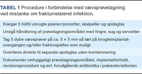 Mikrobiologisk diagnostik er afgørende i forhold til den efterfølgende antibiotikastrategi. Således udgør mikrobiologisk dyrkning af peroperative vævsprøver en diagnostisk hjørnesten i udredningen. Hvis muligt anbefales to ugers antibiotikapause inden prøvetagning for at undgå risiko for negative eller ikkeretvisende dyrkningssvar, som ses ved FRI hos op mod 30% [3, 16]. Det er endnu ikke tilstrækkelig belyst, om en enkelt præoperativ antibiotikadosering øger risikoen for falsk negative dyrkningsfund ved FRI. I et inficeret, lukket felt anbefales tidlig vævsprøvetagning ved operationen (inden bløddelsrevision og skylning) i form af fem vævsprøver med rene, separate utensilier fra knogle-implantat-overgangen og/eller frakturspalten (Tabel 1). I et åbenstående sår skal den kontaminerede overflade bortrevideres før vævsprøvetagning, mens overfladiske vævsprøver, podninger og prøver fra fistelgange frarådes pga. kontaminering [17].