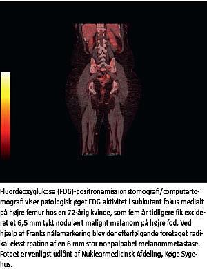 Behandlingen af kutant malignt melanom er så vidt muligt kirurgisk radikal intervention. Ved avanceret melanomsygdom spiller billeddiagnostik en væsentlig rolle i stadieinddeling og vurdering af kirurgisk tilgængelighed. Melanomceller har sædvanligvis et højt optag af glukoseanalogen 18F-fluordeoxyglukose (FDG) og benyttes derfor til funktionel billeddannelse ved helkrops-positronemissionstomografi (PET), FDG-PET. FDG-PET fusioneret med computer tomografi (CT) i form af FDG-PET/CT har høj nøjagtighed ved detektion af metastatisk og recidiverende melanomsygdom og er den primære modalitet ved mistanke om avanceret sygdom. Teknikken muliggør identifikation af metastatisk sygdom på et stadie, hvor den ikke er klinisk detekterbar. Ved mistanke om lunge- eller hjernemetastaser bør undersøgelsen suppleres med henholdsvis CT eller magnetisk resonans-skanning.
