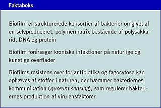 Både evnen til at dan ne biofilm og evnen til at kommunikere med specielle signalmolekyler findes formentlig blandt størstedelen af bakteriearterne. Bakterier kommunikerer som anført ved at syntetisere og reagere på signalmolekyler. Betegnelsen QS hentyder til, at systemet tillader bakterierne at mærke, hvornår et kritisk antal bakterier er fremvokset på et begrænset område i værtsorganismen og som reaktion herpå at aktivere bestemte gener, så de producerer f.eks. virulensfaktorer o.l. I mange grampositive bakterier er QS-signalmolekylerne peptider, mens de mest kendte i gramnegative bakterier er N-acyl-L-homoserin-laktoner (AHL). Det klassiske eksempel er aktivering af bioluminescens (lysproduktion) i Vibrio fischeri, og de fleste AHL-producerende bakterier er knyttet til højere organismer som planter og dyr, hvor de er symbionter eller patogener [2]; det gælder f.eks. de menneskepatogene bakterier P. aeruginosa, Yersinia enterocolitica og Brucella melitensis . AHL syntetiseres af syntaseproteiner og samarbejder med transkriptionelle regulatorproteiner for at regulere ekspressionen af specifikt modtagelige gener, der f.eks. hos P. aeruginosa kontrollerer produktionen af virulensfaktorer, bl.a. ekstracellulære enzymer og cellelysiner (f.eks. rhamnolipid), der har betydning for sygdomsprocessen [16]. Bakterierne bliver således først virulente patogener, når de når et antal, hvor QS-systemet aktiverer virulensfaktorerne. Indtil da er de mere uskadelige kolonisatorer. QS kan muligvis også have betydning for biofilmens udvikling [17], og QS har vist sig at have afgørende betydning for biofilmens tolerans over for antibiotikabehandling og det innate inflammationsrespons eksemplificeret ved de polymorfnukleære leukocytter (PMN) [11, 18].