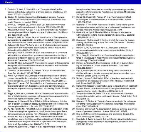 Summary Foreign body infections - biofilms and quorum sensing: Ugeskr Læger 2007;169(48):4163-4167 Biofilms are structured consortia of bacteria embedded in self-produced polymer matrix. Biofilms are resistant to antibiotics, disinfectives and phagocytosis. The persistence of foreign body infections is due to biofilms. Chronic P. aeruginosa lung infection in cystic fibrosis patients is a biofilm. Bacteria in biofilms communicate by means of quorum sensing which activates genes for virulence factors. Biofilms can be prevented by antibiotic prophylaxis or early therapy or by quorum sensing inhibitors which make them susceptible to antibiotics and phagocytosis.