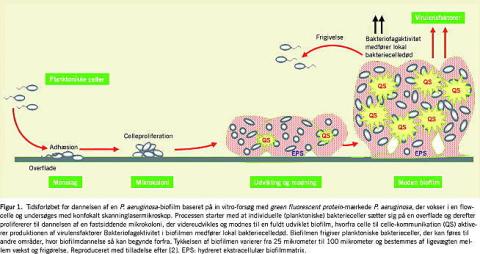 Fremmedlegemeinfektioner er karakteriseret ved, at bakterier eller svampe vokser på fremmedlegemets indre og/eller ydre overflader som et lag, der holdes sammen af en biopolymermatrix, som mikroorganismerne selv har produceret. Denne vækstform kaldes sessil (fastgjort) eller en biofilm. Definitionen af en biofilm er således »et struktureret konsortium af celler (bakterier og/eller svampe) omgivet af en selvproduceret polymermatrix«. Matrix kan indeholde både polysakkarid, protein og DNA, og det mikrobielle konsortium kan indeholde en eller flere arter, som kan leve i symbiose med hinanden [1]. Matrix tilfører biofilmen strukturel stabilitet og yder beskyttelse mod en række ydre faktorer. Udviklingen af bakterielle biofilm over tid er studeret i konfokale skanninglasermikroskoper med anvendelse af green fluorescent protein -mærkede bakterieceller. Denne teknik kan kombineret med avanceret in silico-billedbehandling frembringe rumlige (tredimensionale) billeder af biofilm. For Pseudomonas aeruginosa -bakteriernes vedkommende udvikler en moden biofilm sig i løbet af knap en uge (Figur 1 ). Biofilmopbygningen indledes med, at individuelle (planktoniske), fritsvømmende mikrober bindes reversibelt til en overflade, som kan være konditioneret af protein o.a. i en pellikel. På det tidspunkt er bakterierne stadig følsomme for antibiotika, hvilket kan være forklaringen på antibiotikaprofylaksens effektivitet ved alloplastikoperationer. Dernæst følger irreversibel binding til overfladen, hvorefter bakterierne deler sig og danner mikrokolonier på overfladen og begynder at omgive sig med den selvproducerede matrix. Biofilmen bliver herefter tyk (op til 50 mikrometer) og man kan iagttage dannelsen af svampelignende eller tårnlignende strukturer. Biofilmen er nu moden. Senere følger så en fase, hvor lokale områder af biofilmen opløses, og de frigjorte celler kan derefter spredes til andre lokaliteter, hvor opbygning af nye biofilm så kan finde sted. I nogle tilfælde kan denne proces være forårsaget af bakteriofagvirksomhed [3]. Den modne biofilm kan ligefrem indeholde væskefyldte kanaler og dermed minde om primitive, flercellede organismer. Bevægelige bakterier kan ved hjælp af pili klatre op på toppen af biofilmen og kolonisere og dække bakterierne nedenunder [4].