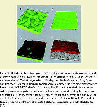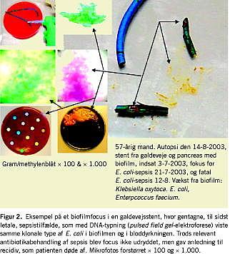 Fremmedlegemeinfektioner udgør et stedse voksende problem i moderne medicin og strækker sig fra intravenøse katetre, urinvejskatetre, og trakealtuber til stenter (Figur 2), alloplastikmateriale, hydrocefalusventrikeldræn og kunstige hjerter [29]. Bliver et sådant fremmedlegeme koloniseret med en biofilm, kommer der kronisk inflammation omkring fremmedlegemet, som enten må fjernes eller behandles med sommetider livslang antibiotisk suppressionsterapi. Man har derfor introduceret antibiotikadækkede fremmedlegemer (katetre, karproteser o.l.) for at forebygge biofilmdannelsen, og det har også vist sig at have gunstig effekt [30, 31]. På grund af risikoen for resistensudvikling og allergi over for de pågældende antibiotika er det dog ønskeligt, at der udvikles andre stoffer, og her kommer QSI-farmaka stærkt ind i billedet. Det har da også vist sig in vitro, at QSI synergistisk kan forstærke antibiotikas og PMN's manglende effekt på biofilm, så den kan bekæmpes effektivt (Figur 3) [10, 16]. Disse interessante og lovende resultater danner basis for danske forsøg på videreudvikling af QSI til lægemidler til mennesker, der f.eks. får fremmedlegemer implanteret. Hvis det lykkes, vil det have meget store positive konsekvenser for moderne invasiv medicinsk behandling.