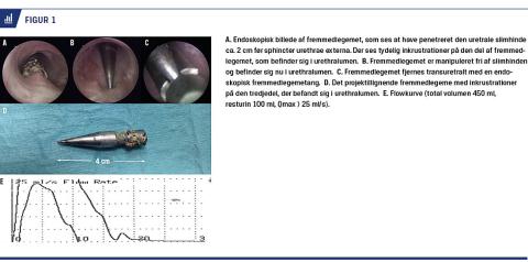 En 44-årig mand henvendte sig til en urologisk modtagelse med skrotale smerter efter at være faldet ned på en cykelstang. I forbindelse med anamneseoptagelsen og den objektive undersøgelse kom det frem, at patienten yndede at sætte to styk 4 cm lange »metalprojektiler« op i urethra for så at »skyde« dem ud i forbindelse med ejakulation. Dette var en tilbagevendende adfærd, og han anførte, at han for nogle uger siden havde bemærket, at kun den ene var kommet ud. Han kunne ikke redegøre for det præcise tidsperspektiv, da han havde været intoksikeret på indførelsestidspunktet. I den efterfølgende periode havde han ikke haft urogenitale gener. Han havde selv forgæves forsøgt at manipulere objektet ud, efter at han var blevet opmærksom på, at det sad i urethra. Ved den objektive undersøgelse fandt man hævelse, rødme og svær ømhed af højre skrotalhalvdel. Det var muligt at palpere metalstykket, som var lokaliseret langt oppe i urethra omkring den penoskrotale overgang, men det kunne ikke manipuleres ud. En ultralydundersøgelse af urethra viste et 4 cm langt fremmedlegeme, der penetrerede den uretrale slimhinde. Dette blev efterfølgende bekræftet ved en flekscystouretroskopi, hvor man så et fastsiddende metalstykke umiddelbart før sphincter urethrae externa.