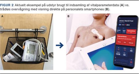 Således stiger risikoen for etårsmortalitet med 20% for hver 10% øget forekomst af episoder med SpO2 < 85% [21], og risiko for myokardieinfarkt og/eller død stiger 3% for hver ti minutters øget varighed af systolisk blodtryk < 90 mmHg [22], navnlig dag 2-4 postoperativt. Forekomst af afvigende vitalparametre målt kontinuerligt er signifikant associeret med efterfølgende myokardieskade og kan danne grundlag for markant tidligere diagnostik af en alvorlig postoperativ komplikation [23]. Med trådløs ekg-monitorering og specifikt udviklede algoritmer kan man observere for atrieflimren. Eksempelvis fik 6,5% af patienter uden kendt tidligere atrieflimren detekteret perioder af mindst 30 minutters postoperativ atrieflimren efter stor kirurgi [24]. Disse tilfælde blev først opdaget senere af det kliniske personale og i en tredjedel af tilfældene slet ikke. Flertallet af indlæggelser på en intensivafdeling fra sengeafdelinger er da også forudgået af afvigende vitalparametre [25]. En yderligere forekomst af uobserverede afvigende vitalparametre må forventes, når patienter i stigende grad udskrives til eget hjem efter kirurgiske og akutte medicinske indlæggelser.