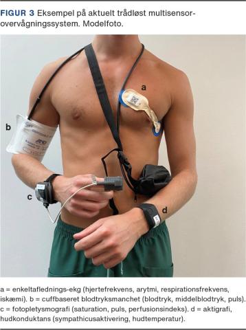 Det ideelle system (Tabel 1) bør baseres på en kritisk analyse af, hvilke vitalparametre der har relation til kliniske outcomes, og bør inkludere sensorer, der validt og kontinuerligt optager disse. Således kan de traditionelle parametre, som SpO2, respirationsfrekvens, puls, blodtryk og temperatur, med tiden blive suppleret eller erstattet af supplerende variable som perfusionsindeks [27], ekg, blodsukker [28], hæmoglobin, laktat, aktivitet mv. Sensorer bør være valide [29], små og trådløse for ikke at forhindre den essentielle fysiske aktivitet (Figur 2 og Figur 3). Fysiologiske data skal optages i så høj opløselighed som muligt for at muliggøre algoritmer, der kan detektere umiddelbare ændringer ved mønstergenkendelse. Denne teknologi har de i dag benyttede simple tærskler, der ikke fungerer i den kliniske hverdag, men som stadig er standard blandt det udstyr, der i dag i stor stil indkøbes til de nye supersygehuse. Data skal kunne integreres i patientjournalen og kombineres med yderligere data såsom blodprøvesvar og komorbiditet og indgå i AI-analyser. Særligt vil der for det enkelte patientforløb være et stort potentiale i at kombinere realtidsvitalparameteranalyse med specifikke risikomarkører ved for eksempel kræftforløb for på den måde at tilrettelægge et overvågningssystem med personalized medicine(Tabel 1).