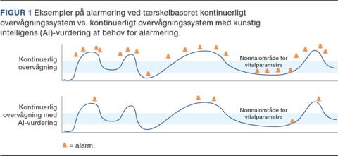 Moderne monitoreringsudstyr kan i høj grad øge detektionen af afvigende værdier, men næppe alle disse er klinisk betydende. Hvis et alarmeringssystem skal være relevant i klinisk brug, skal sensitivitet og specificitet optimeres til både at opdage alle kritiske forværringer og undgå overalarmering og deraf følgende alarmtræthed (alert fatigue). Et nyligt studie fra forskningsprojektet WARD (Wireless Assessment of Respiratory and circulatory Distress) med 500 patienter efter stor abdominal kræftkirurgi målte vitalparametre kontinuerligt i op til 96 timer postoperativt (Figur 1, Figur 2 og Figur 3) [6]. Den kumulerede tid med afvigende vitalparametre var ikke statistisk signifikant forskellig mellem de patienter, der senere udviklede kliniske komplikationer (any serious adverse event), og de patienter, som ikke gjorde. Hvis et simpelt system alarmerede, hver gang en vitalparameter krydsede tærsklen til abnorm værdi, ville det i gennemsnit generere > 70 alarmer pr. patient pr. dag. Dette peger på potentiale for videre analyse af data med AI og machine learning for at øge prædiktionen af komplikationer [26] (Figur 1). Der er stigende evidens for, at indførelse af kontinuerlig monitorering reducerer patientnære outcomes svarende til antallet af akutteamkald og overflytninger til intensivafdeling, men der er behov for pragmatiske randomiserede forsøg med test af, hvordan kontinuerlig AI-understøttet monitorering forebygger komplikationer.
