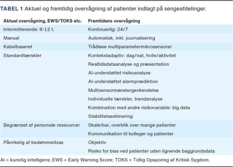 Markante fremskridt inden for sensorteknologi og matematisk modellering har i de seneste år muliggjort kontinuerlig trådløs overvågning og kunstig intelligens (AI)-vurdering af de indsamlede data i forhold til behovet for alarmering. Dermed begynder vi at se muligheden for markant øget overvågning på sengeafdelinger, hvis teknologien tilpasses den kliniske virkelighed.