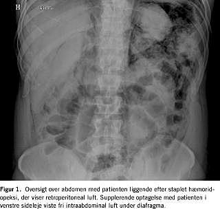 En 38-årig, tidligere rask mand fik foretaget elektiv staplet hæmoridopeksi som følge af blødende grad IV-hæmorider. Staplingen blev foretaget med Ethicon PPH03 med patienten i stensnitleje [2]. En forudgående rektoskopi viste normale forhold. Stapleren indeholdt en fyldig og intakt vævsring uden patologiske forandringer. Blødning fra staplerlinjen blev elkoaguleret med diatermi tillige med to puder hæmoridvæv, og der blev anbragt en spongostanmèche inden for anus. Patienten klagede få timer postoperativt over smerter i nedre abdomen og i højre del af scrotum, hvor der var emfysem. På mistanke om lækage blev der påbegyndt intravenøs antibiotikabehandling med gentamicin, penicillin og metronidazol. På den anden postoperative dag klagede patienten fortsat over smerter, som var morfikakrævende. Et røntgenbillede af thorax viste fri luft intra- og retroperitonealt. På tredjedagen postoperativt var abdomen distenderet med tympanisme i alle fire kvadranter. På en røntgenoversigt over abdomen sås større mængder fri retroperitoneal og subdiafragmatisk luft (Figur 1 ). Antibiotikabehandlingen blev suppleret med ilttilskud på 5 l/min. Ved en akut anorektoskopi sås en normalt udseende anus uden udfald og med staplerlinjen beliggende 6-7 cm over den anokutane overgang uden påviselige defekter eller nekrotiske partier. På den fjerde postoperative dag blev der udført en computertomografi, som viste fri luft omkring rectum, langs funiklen, strækkende sig retroperitonealt og videre op i mediastinum posterior. Desuden var der en mindre mængde fri luft intraperitonealt i krøs og i lille sæk. På den femte postoperative dag forlangte patienten at blive udskrevet. Et kontrolrøntgenbillede af thorax og abdomen på den sjette postoperative dag viste ingen fri luft i peritoneum og betydelig regression i retroperitoneum. Patienten var i hele forløbet afebril og relativt upåvirket, men B-leukocytter og P-C-reaktivt protein var forhøjede.