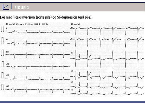 Dag 1 om eftermiddagen fik hun under let havearbejde pludseligt indsættende, brændende retrosternale brystsmerter med udstråling til begge arme. Symptomerne varede en halv time og gentog sig senere på aftenen. Dag 3 havde hun migræne og tog frovatriptan. Dag 4 tog hun til egen læge, der indlagde hende, idet ekg var med T-taksinversion og